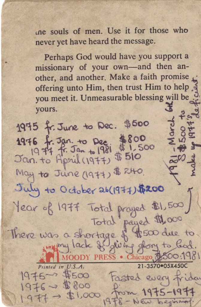 So in year 1975 I pledged Rm500. And God supplied. Then in year 1976 I raised the giving to Rm800. God again graciously provided. In year 1977 I preached on Faith Promise Offering (without handing out pledge forms. It was a personal “secret deal” with God & God alone.
